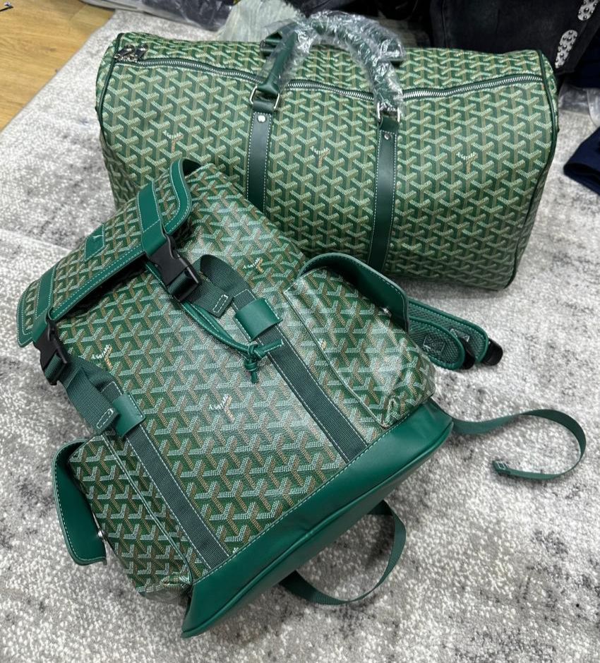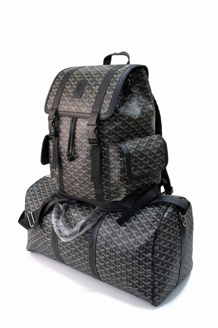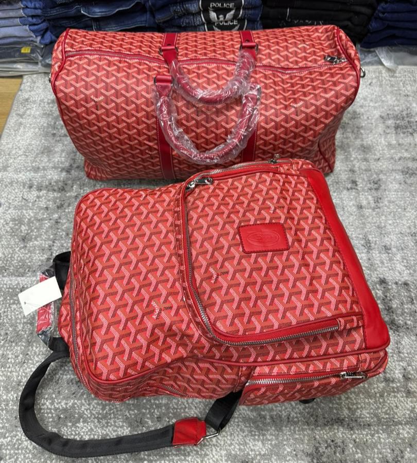 Les deux sacs dans l'image sont des sacs de voyage rouges avec un motif géométrique en forme de "G" stylisé en blanc et rouge. 1. *Sac du haut* : C'est un grand sac de voyage (duffel bag) avec deux anses en cuir rouge protégées par du plastique transparent, une fermeture éclair principale et une poche avant zippée. 2. *Sac du bas* : C'est un sac de voyage plus petit avec une bandoulière noire réglable et un compartiment principal zippé avec une poche avant supplémentaire. Il porte un logo en relief sur le devant. Vous voulez en savoir plus sur ces sacs (marque, prix, utilisation) ?